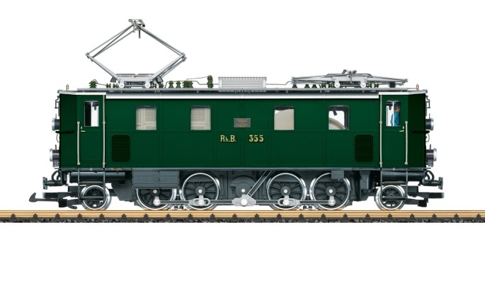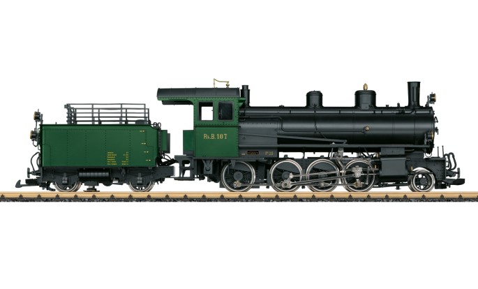 Das LGB Modell gibt den Betriebszustand der 80er Jahre wider und wird durch zwei passende Personenwagen ergänzt. (30142 und 33205)