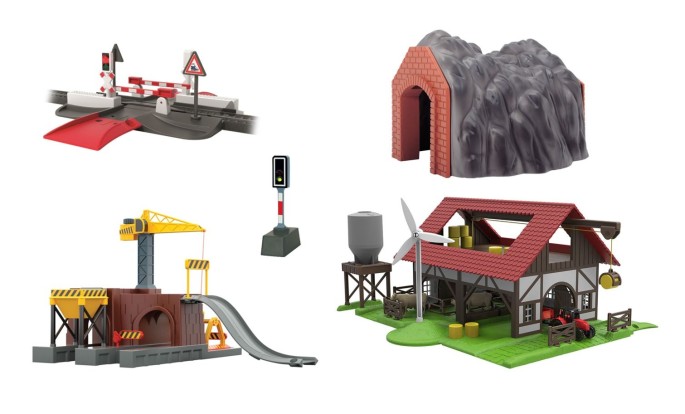 Wie wäre es mit einem Signal mitsamt Licht, einem Bahnübergang mit Licht und Soundfunktion, einem Bahnsteig mit Licht, einer Verladestation mit Kran, einem Tunnel, einer Brücke oder gleich einer ganzen Farm?