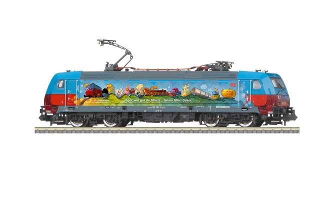 Auf der bunt gestalteten Seitenwand der Lok ist groß zu lesen: "Egal wie gut du fährst - Günni fährt Güter". Vielleicht auch eine kleine Anspielung darauf, dass Güter auf der Schiene immer besser unterwegs sind. Mit den großen Augen auf der Front und den schönen Zeichnungen auf den Seitenwänden der Lok ist diese 185er ein echter Hingucker, sowohl im Vorbild als auch auf der Modellbahn.