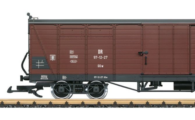 Modell eines gedeckten Güterwagens der Bauart GGw, wie er noch lange bei der DR auf den Schmalspurbahnen in Sachsen im Einsatz war. Originalgetreue Farbgebung und Beschriftung der DR Epoche III. Metallradsätze.