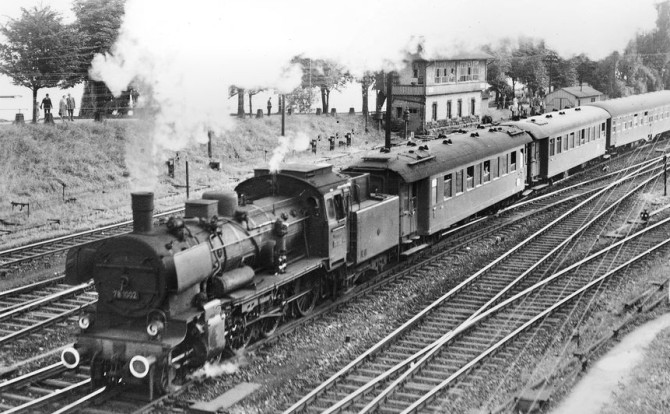 Oben: Die 78 1002 vor einem Schnellzug in Radolfzell 1954 (copyright Carl Bellingrodt/Eisenbahnstiftung)